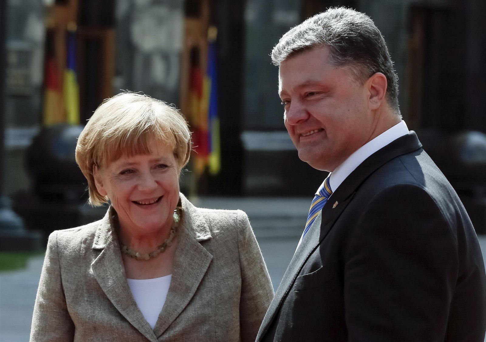 Angela Merkelová přiletěla na Ukrajinu. Přivítal ji s kyticí prezident Porošenko