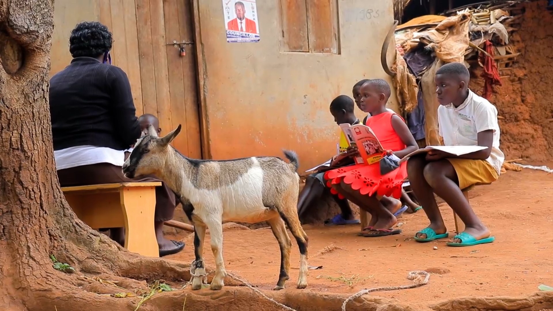 Ugandská distanční výuka s kozou v zádech