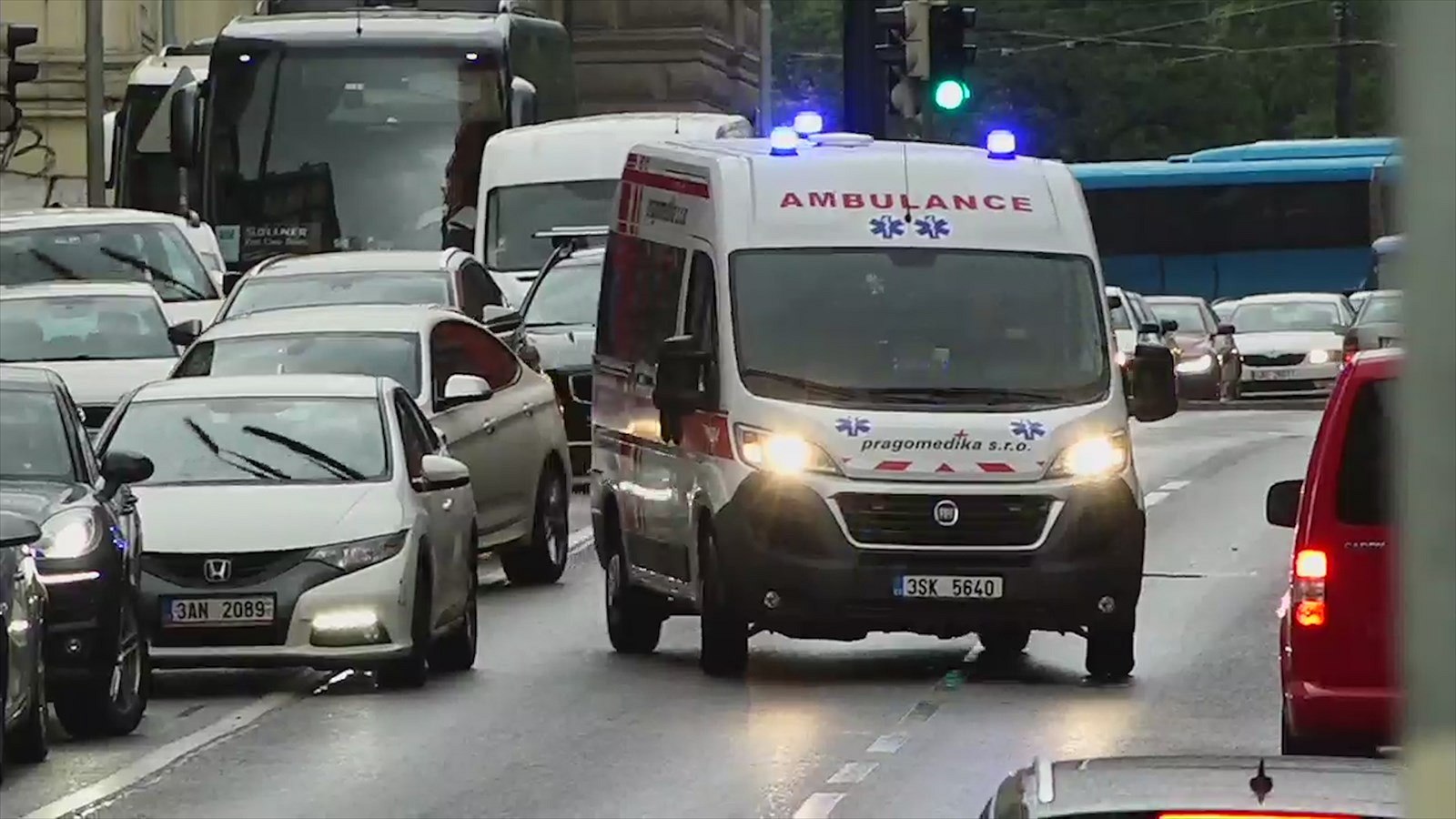 Houkající sanitka se stěží proplétala Resslovou ulicí plnou aut