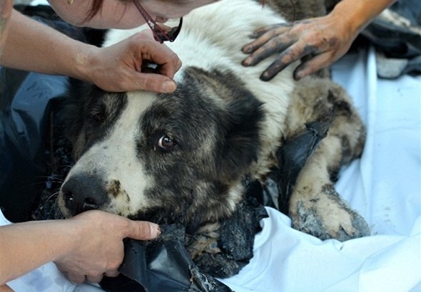 Hasiči zachránili hlídacího psa uvízlého v asfaltové kaluži