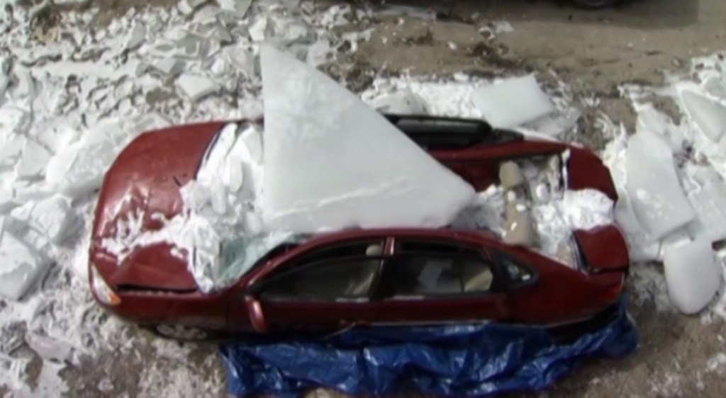 Kus ledu spadl ze střechy a zničil auto