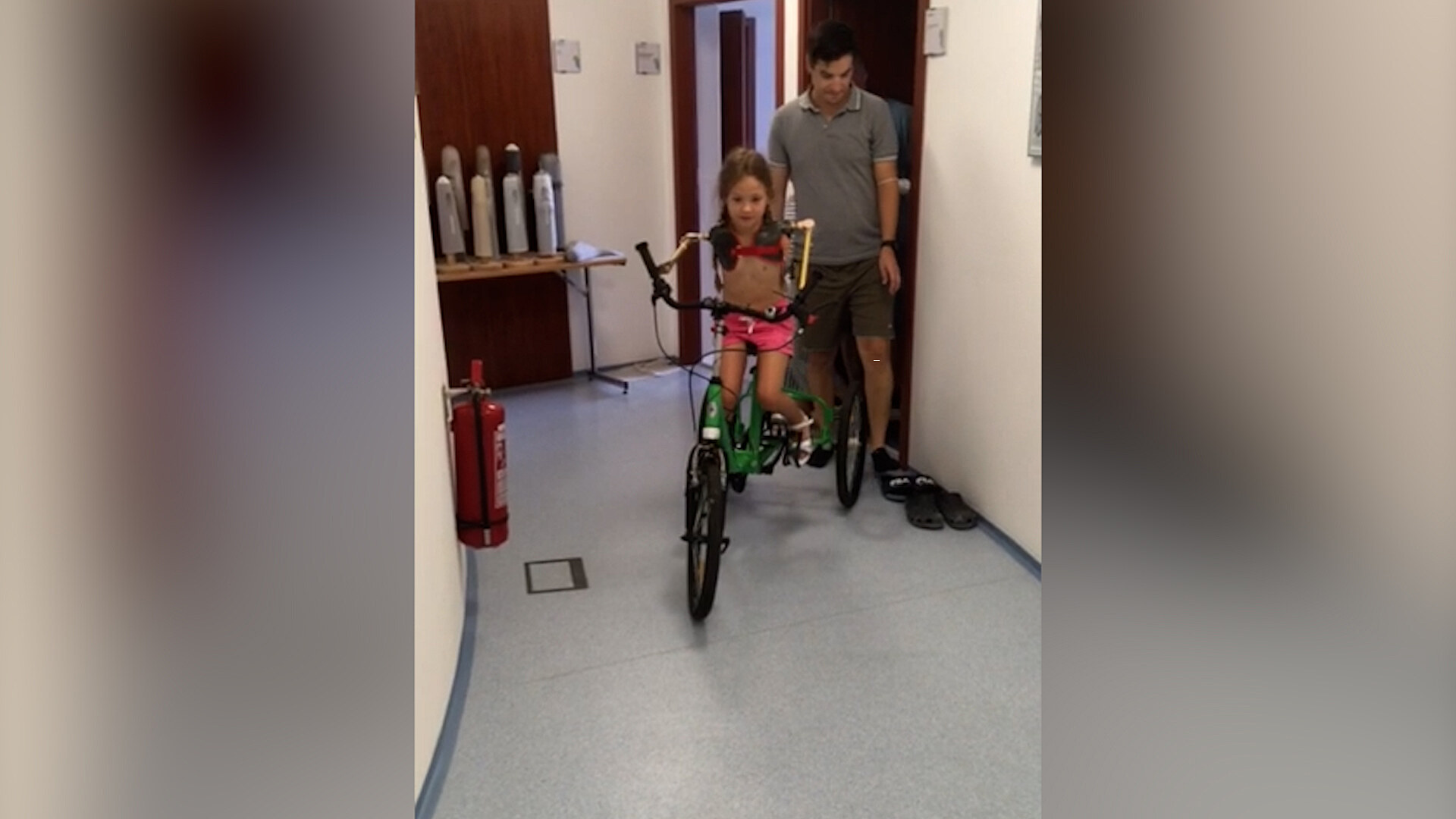 Lili se učí se speciálními protézami jezdit na tříkolce
