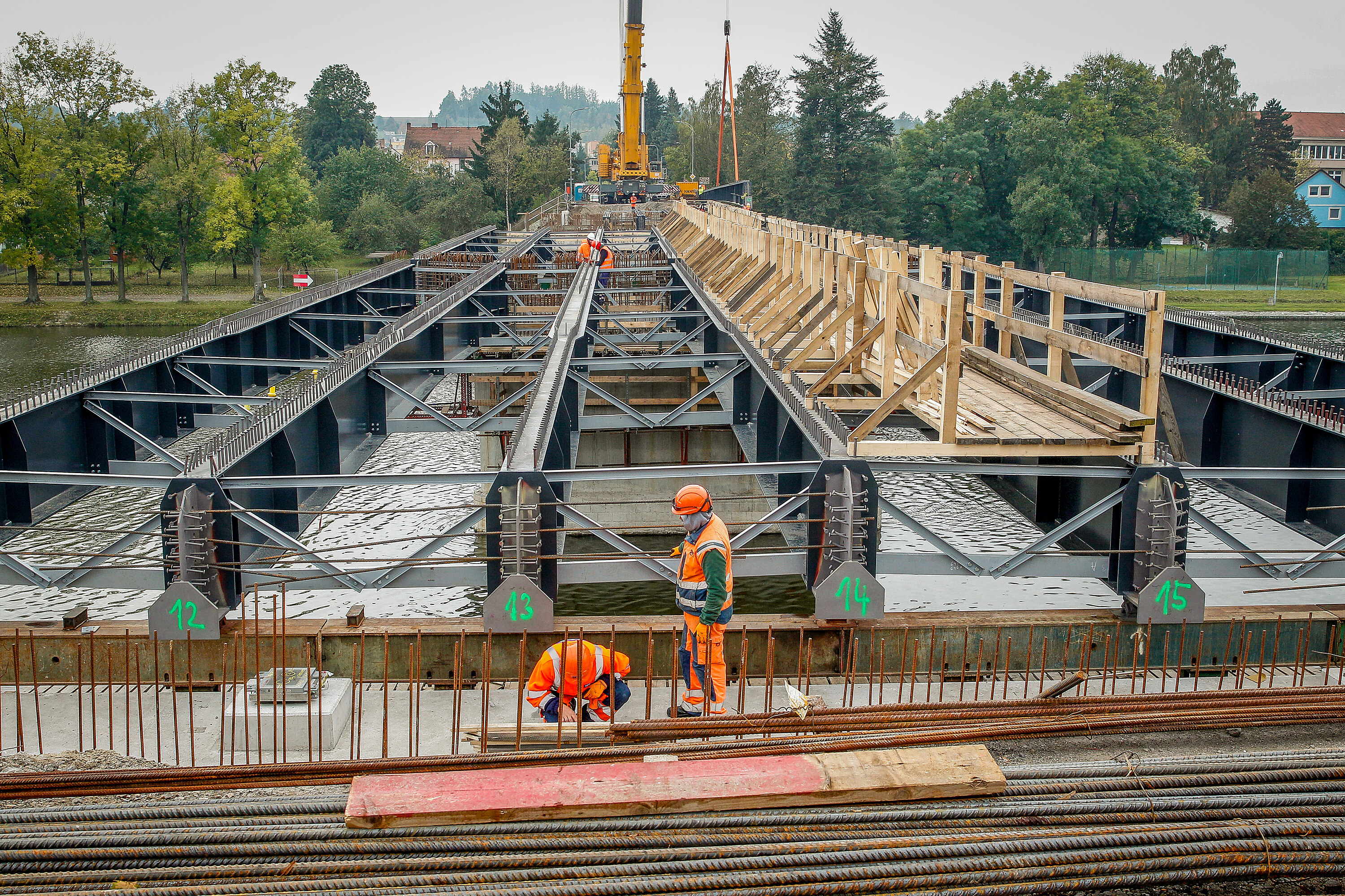 Nad řekou Vltavou v Týně nad Vltavou na Českobudějovicku se už rýsuje nová mostovka. Stavebníci ji skládají z celkem 28 nosníků. Hotovo má být v červnu příštího roku.