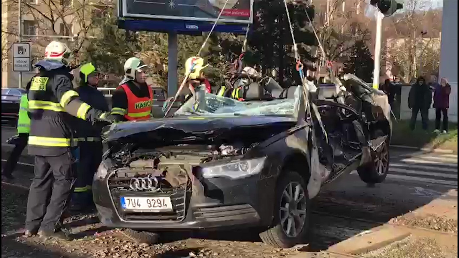 Tramvaj zdemolovala auto. Audi odtlačila do sloupu