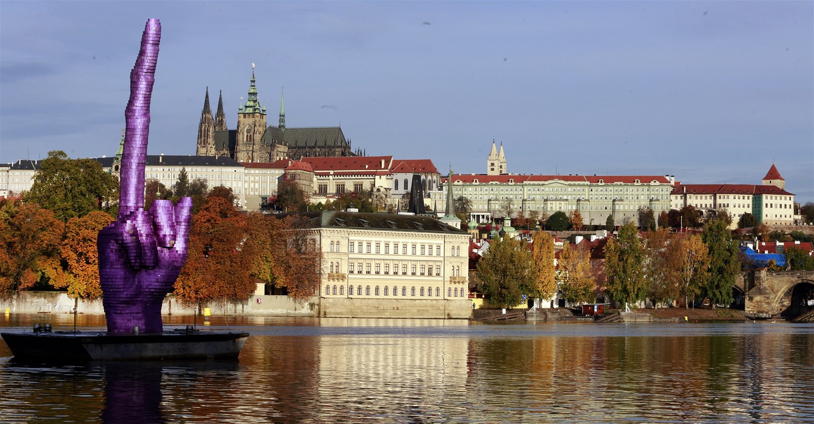 Obří vztyčený prostředníček míří z Vltavy na Hrad