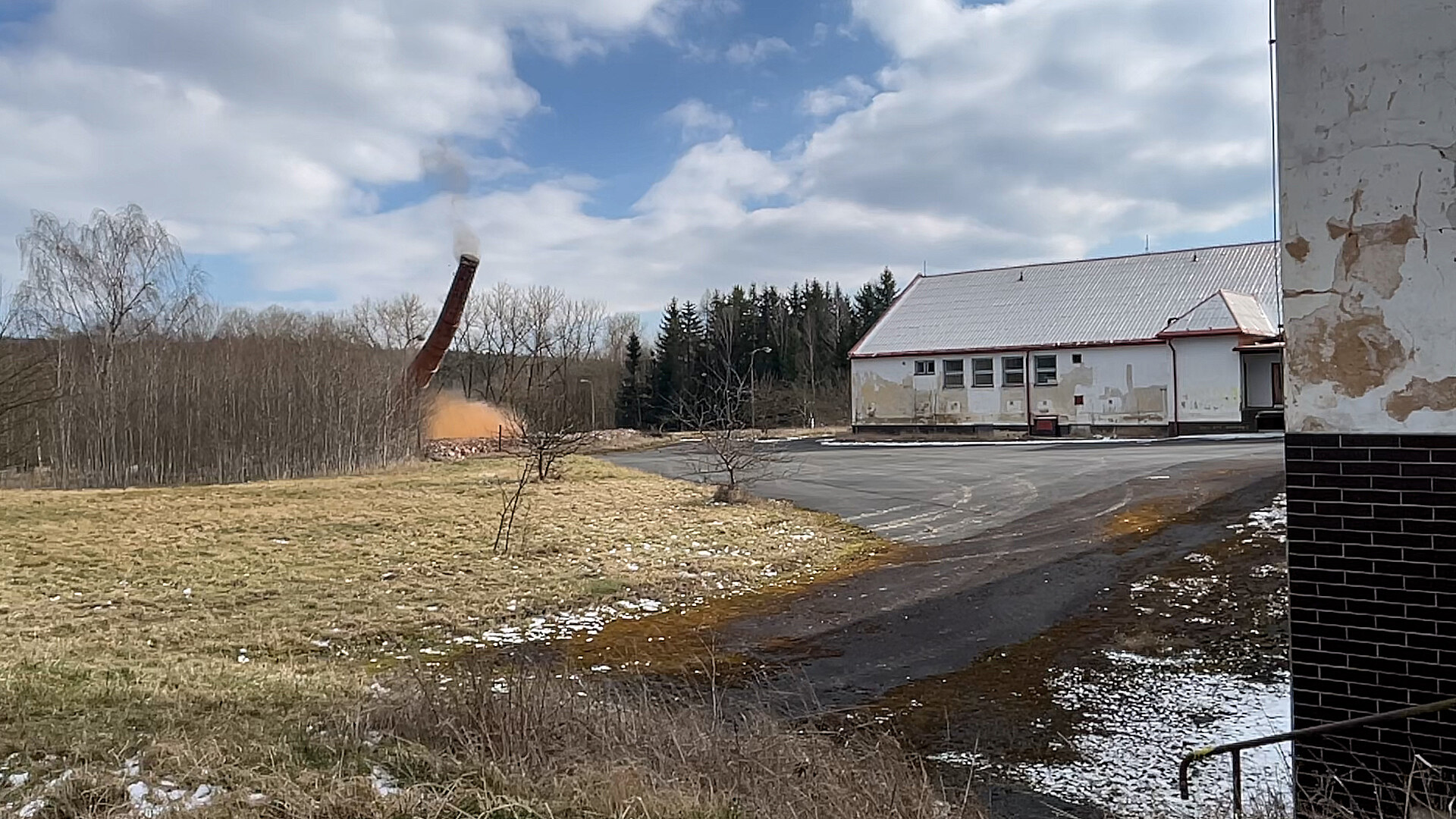 Odstřel komína v bývalých kasárnách Klimentov