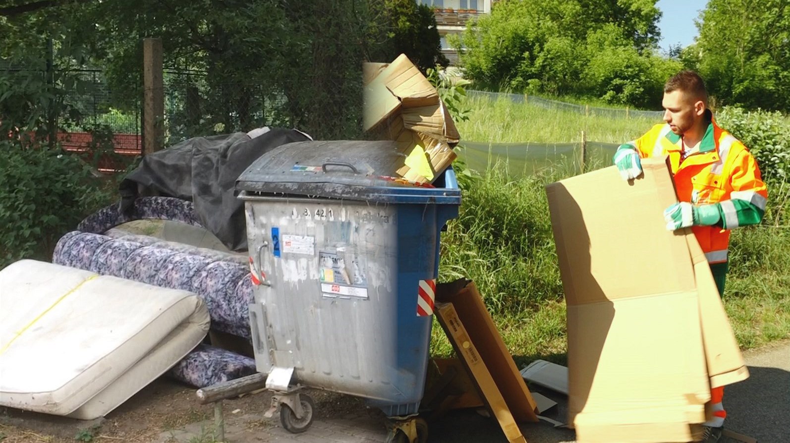 Vedle kontejnerů na tříděný i směsný odpad se často nachází nepořádek. Lidé totiž odkládají věci i vedle nádob. Někdy tam ale leží ještě několik týdnů – popeláři totiž některý odpad odvážejí, jiný ale nemusejí. V terénu se o tom přesvědčil reportér iDNES.tv Matěj Smlsal.