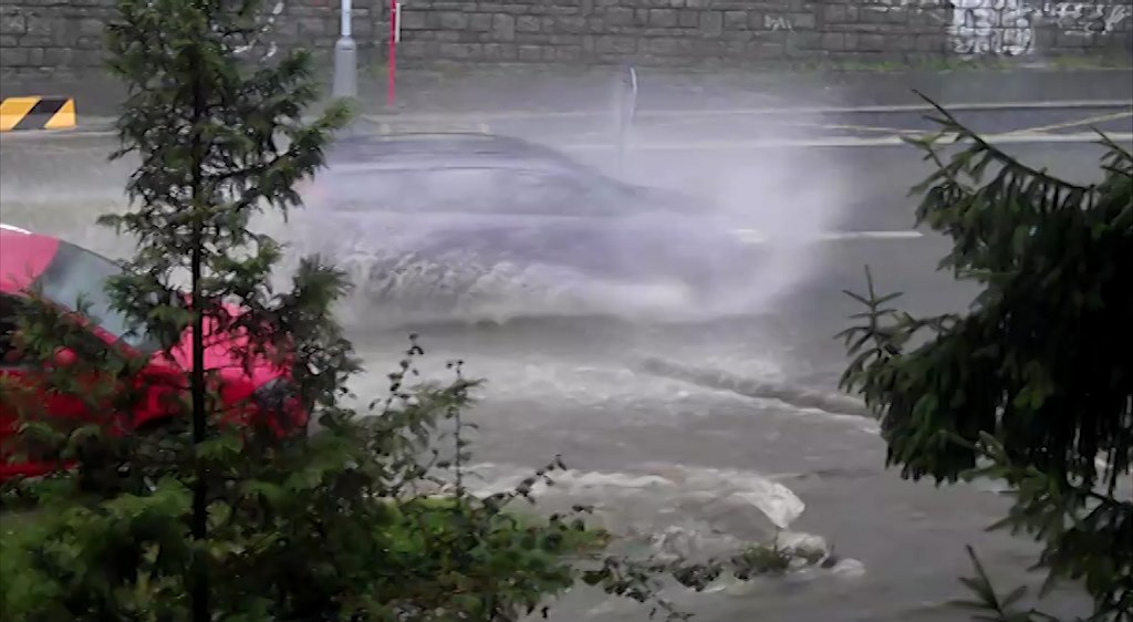 Pražskou Jeremenkovou ulicí se po dešti valí voda