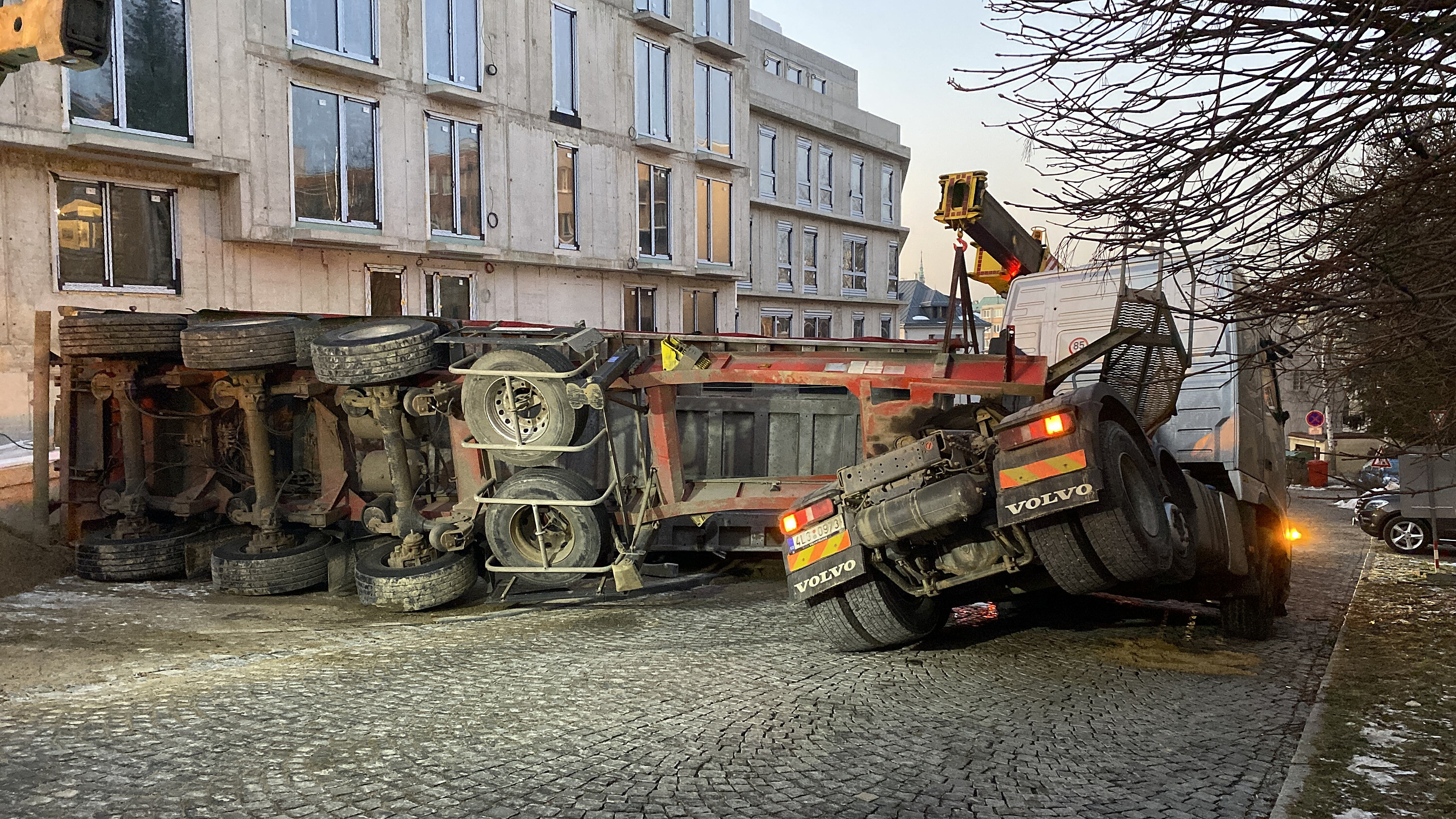 Při vykládání písku se v Liberci převrátil návěs