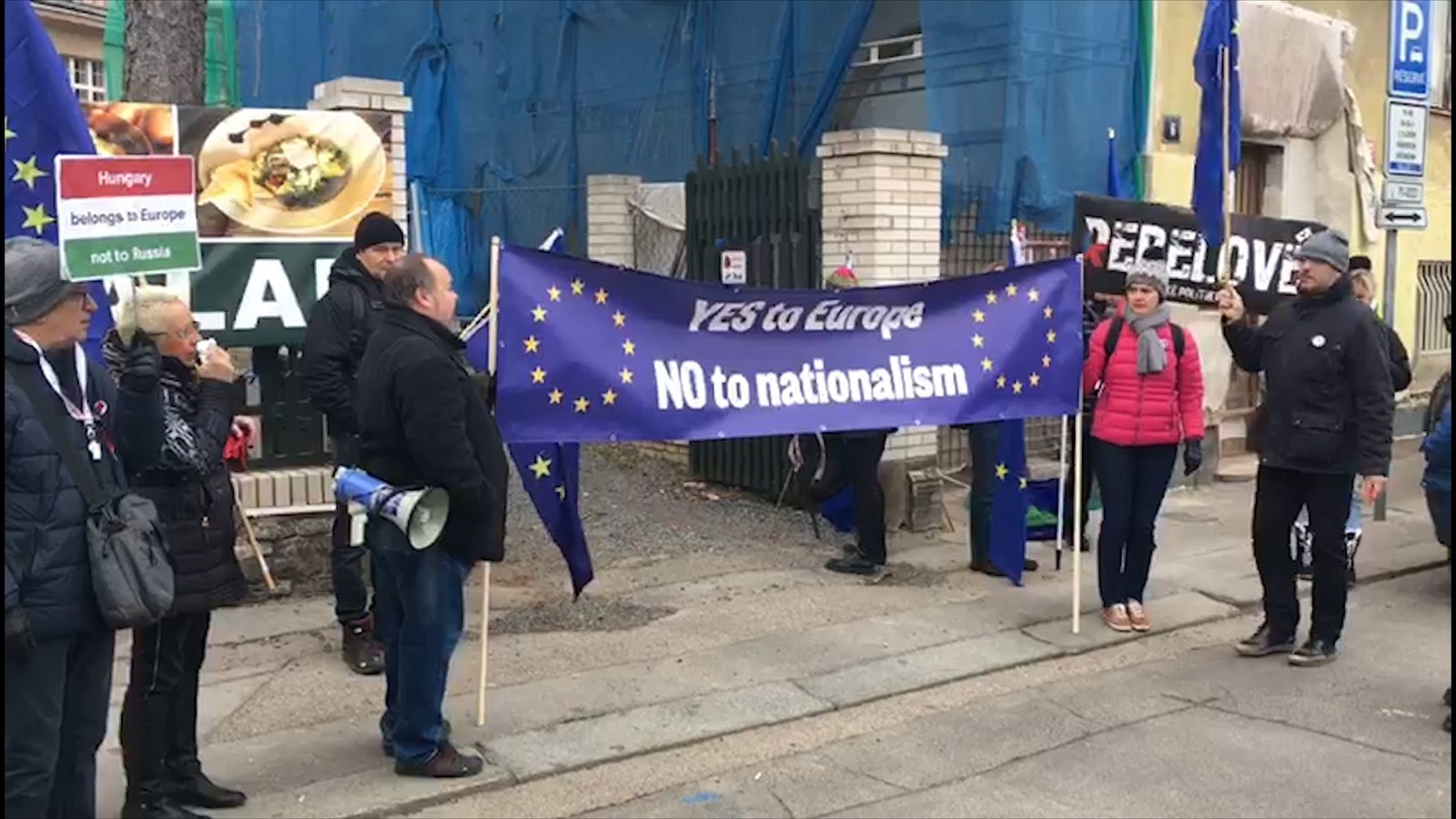 Před Kramářovou vilou demonstrují lidé proti maďarskému premiérovi Orbánovi