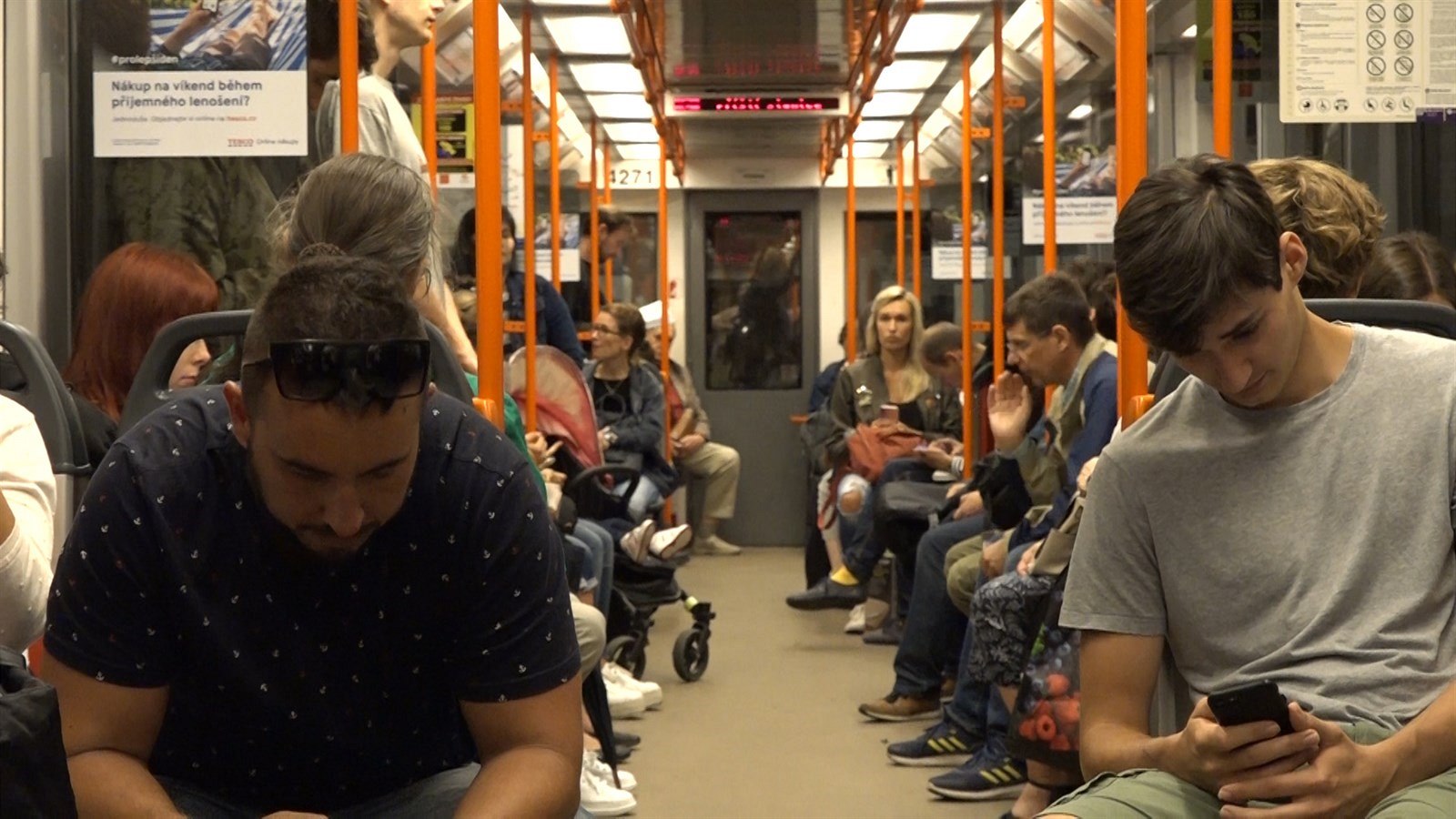 Cestující v metru sedí na nových sedačkách