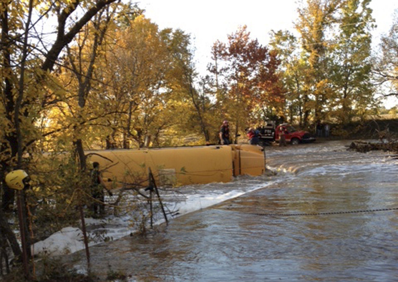 Školní autobus při halloweenské bouři skončil na boku v řece