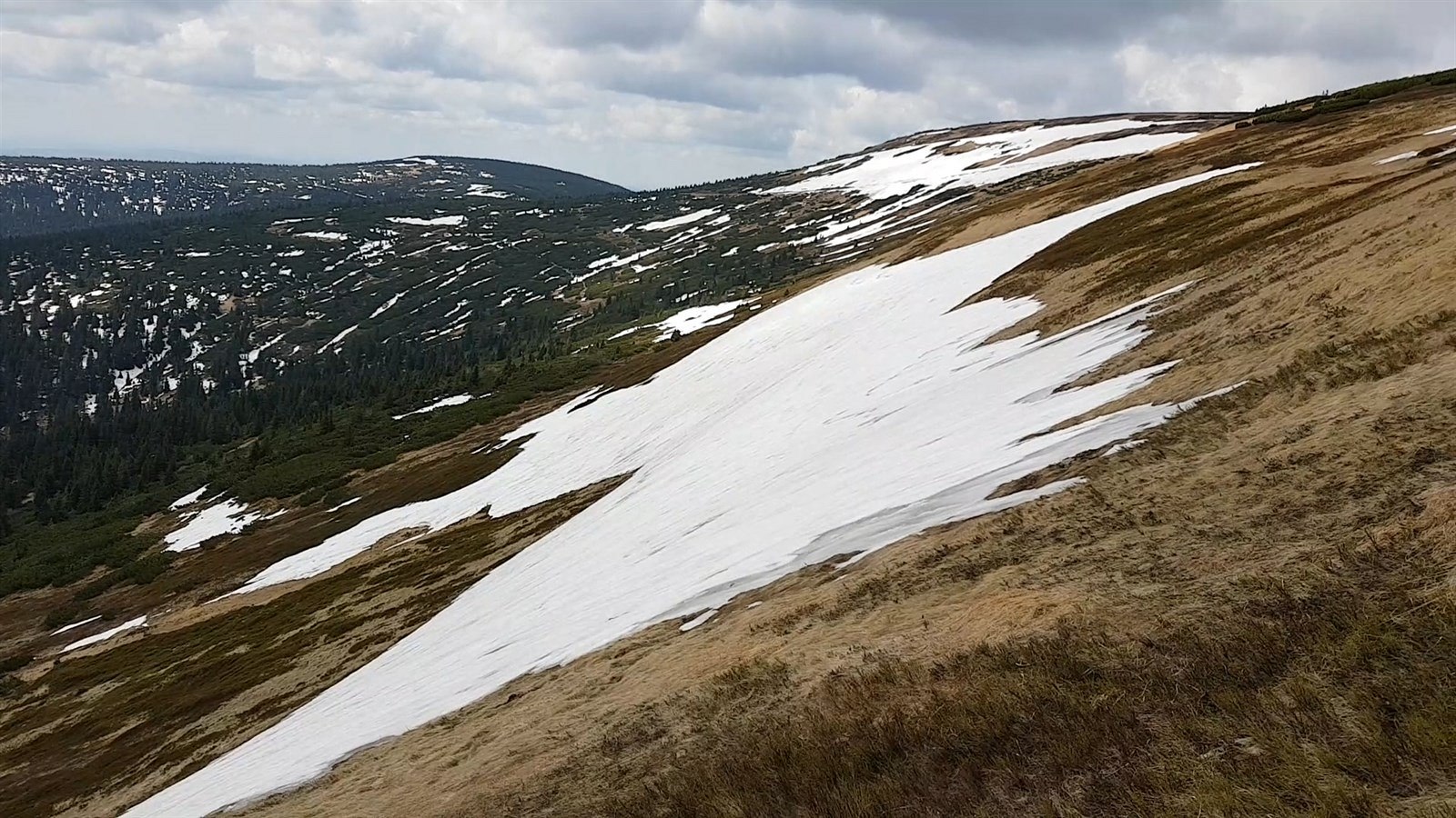 Mapa republiky v Krkonoších letos vydrží jen do poloviny června. Pak sněhová návěj na úbočí Studniční hory připomínající svým tvarem obrysy prvorepublikového Československa roztaje. Odhadují to odborníci Krkonošského národního parku.