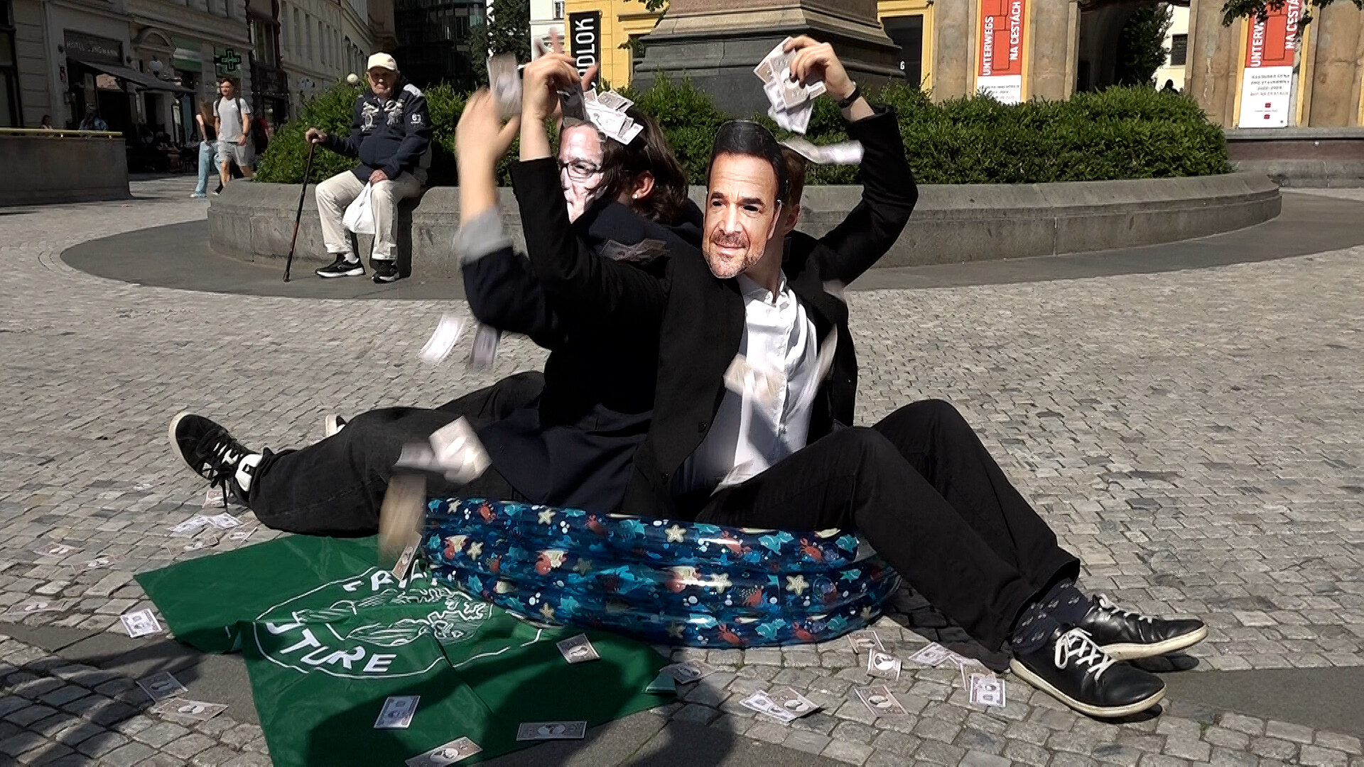 Studenti happeningem upozorňovali na rostoucí zisky fosilních korporací, které vydělávají na prohlubování klimatické krize. Zatímco podle nich lidé trpí kvůli katastrofickým výkyvům počasí, fosilní oligarchové se topí v penězích.