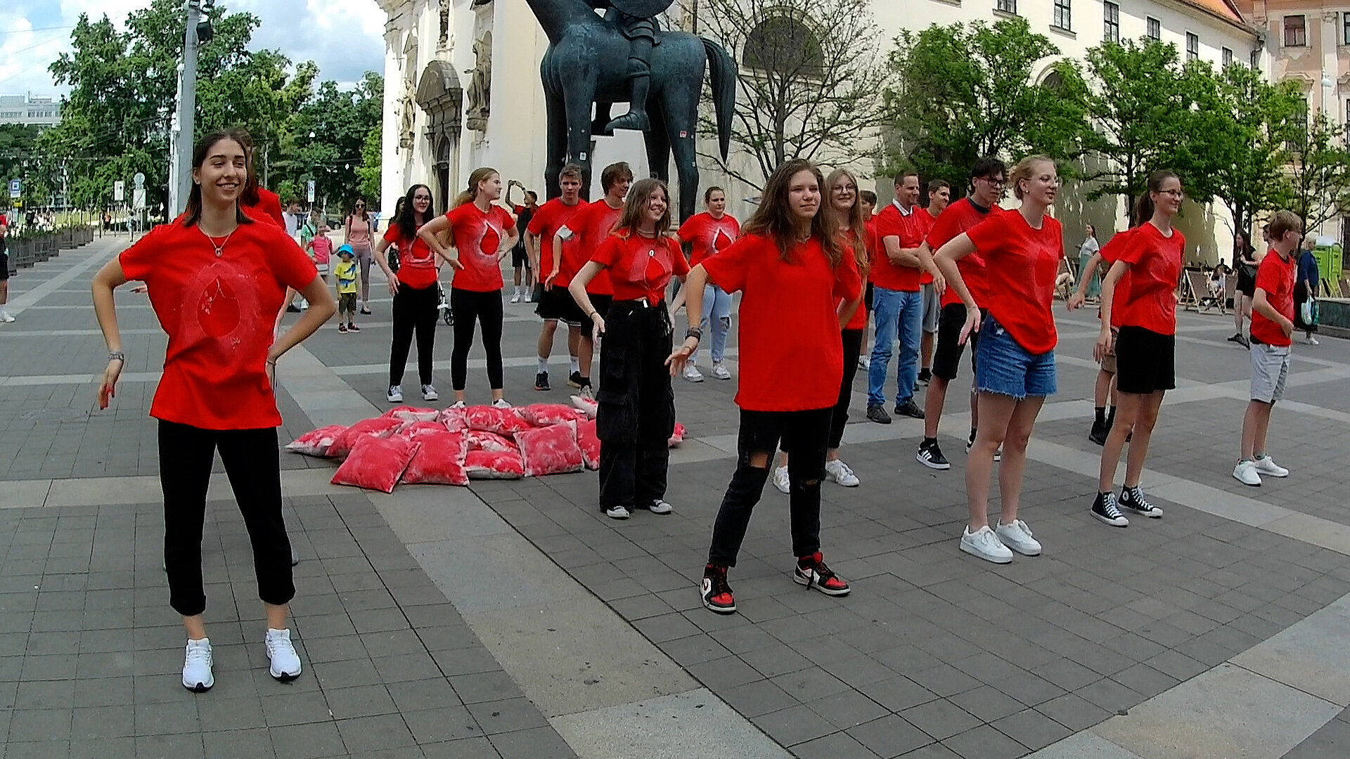 Na tři desítky studentů a studentek v tričkách symbolické červené barvy tančilo na několika místech Brna flashmob. Chtěli tak přilákat nové dárce krve.
