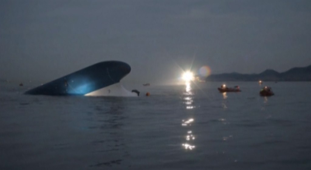 Topící se lidé a vrtulníky u klesajícího trajektu