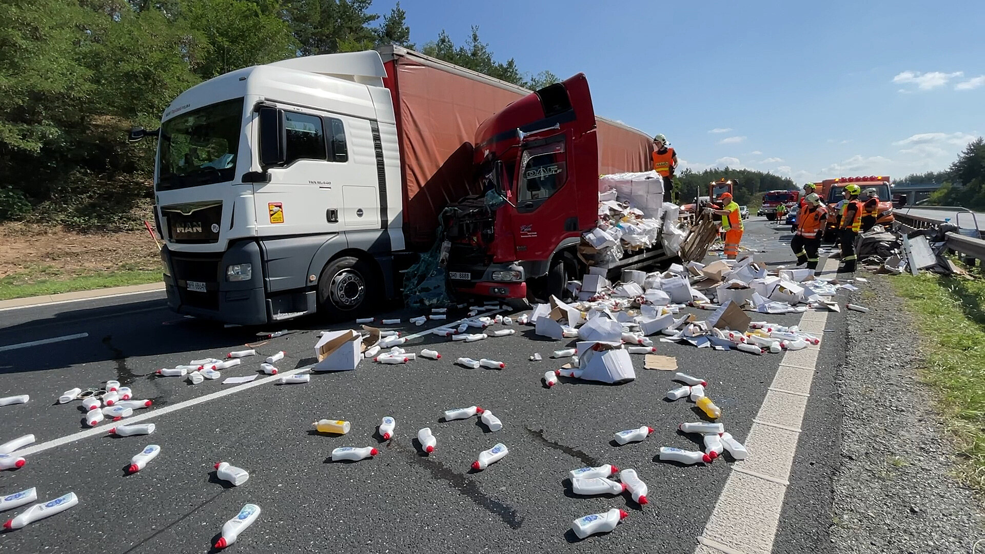 Z kamionu se při nehodě na D11 vysypaly čisticí prostředky