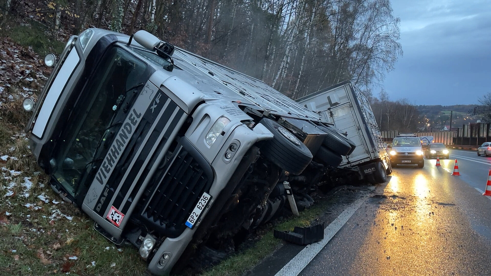 Nákladní vůz s přívěsem plně naložený živými prasaty havaroval v pondělí ráno u Mirošovic. Řidič převrátil do silničního příkopu vůz, přívěs zůstal stát na kolech. Nehoda se naštěstí obešla bez zranění, ale vyprošťování havarovaného vozidla a překládka nákladu omezila provoz.