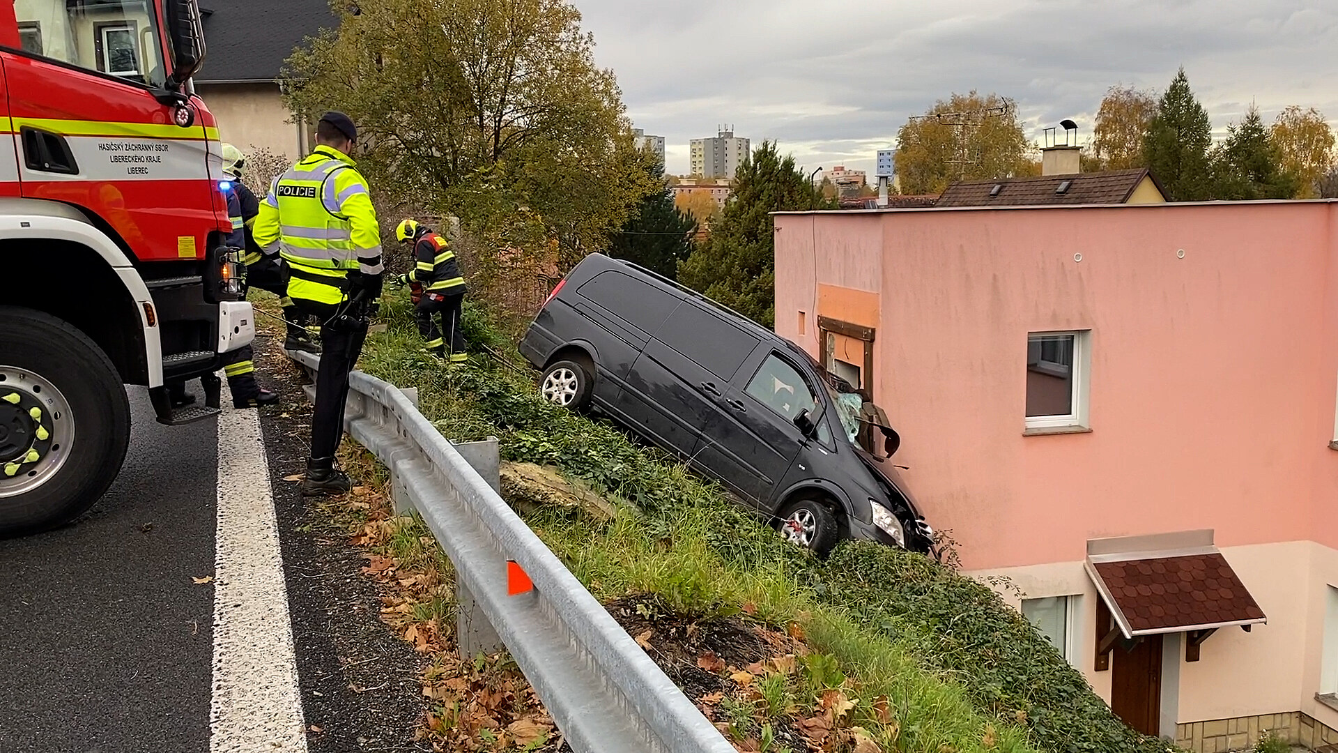 Řidič osobního vozu nevybral v Liberci zatáčku, sjel ze svahu a narazil do rodinného domu. Při nehodě se zranil on i dvě děti, které vezl. Vytížená silnice byla několik hodin uzavřená. Auto museli vyprostit hasiči.