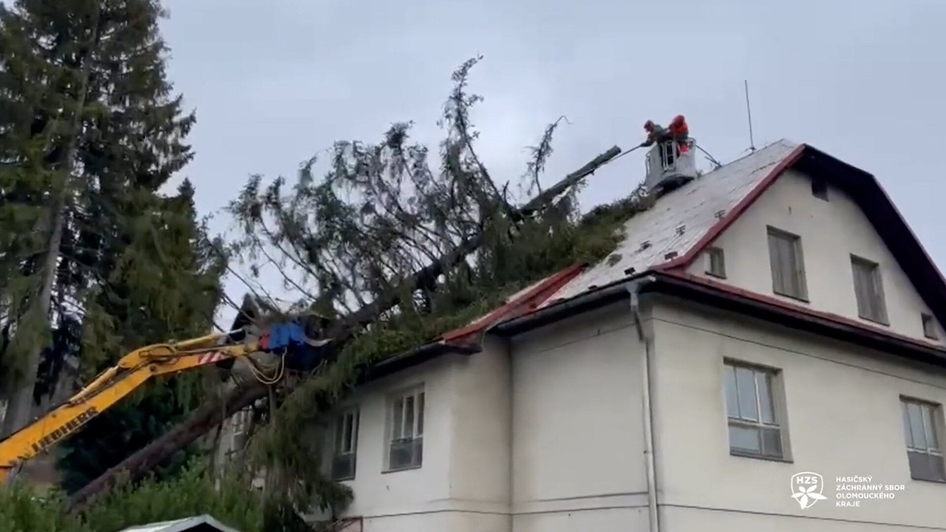 Následky silného větru museli vyjet řešit hasiči v Jeseníku, kde se zlomil vzrostlý strom v jedné z ulic a následně spadl na budovu tamní základní školy.