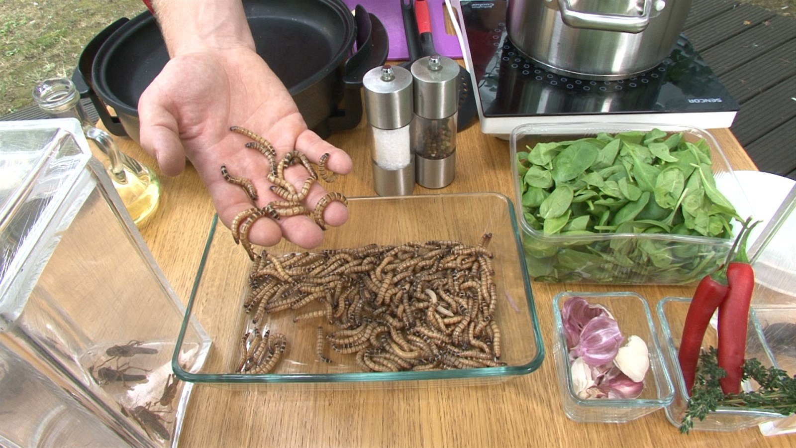 Je libo červy na česneku nebo sarančata se špenátem?