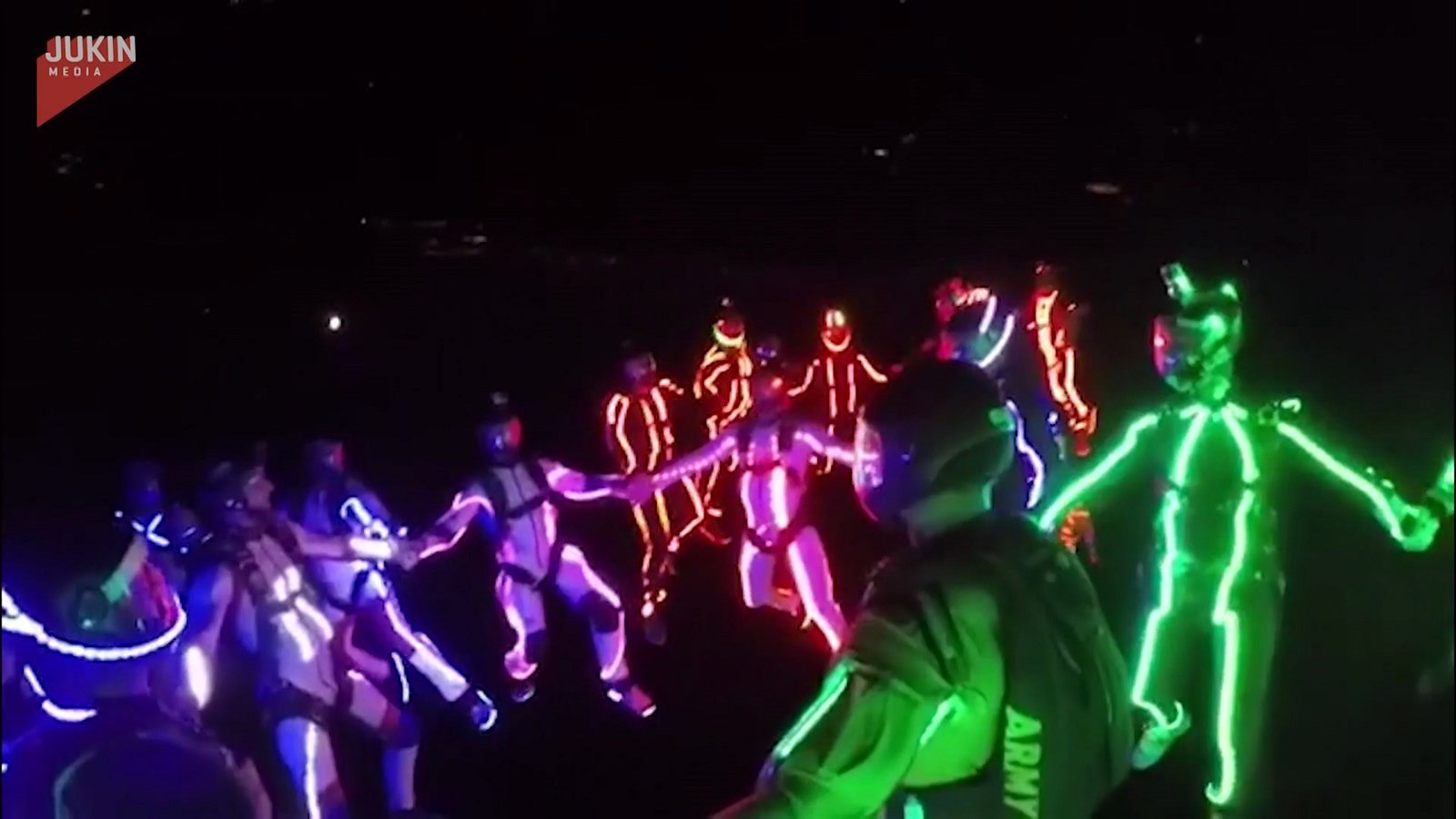 Skupina třiceti parašutistů si vyzkoušela, jaké je to skákat v noci. Díky tomu, že měli na kombinézách LED světla různých barev. Ve tmě vytvořili opravdu pozoruhodnou podívanou.