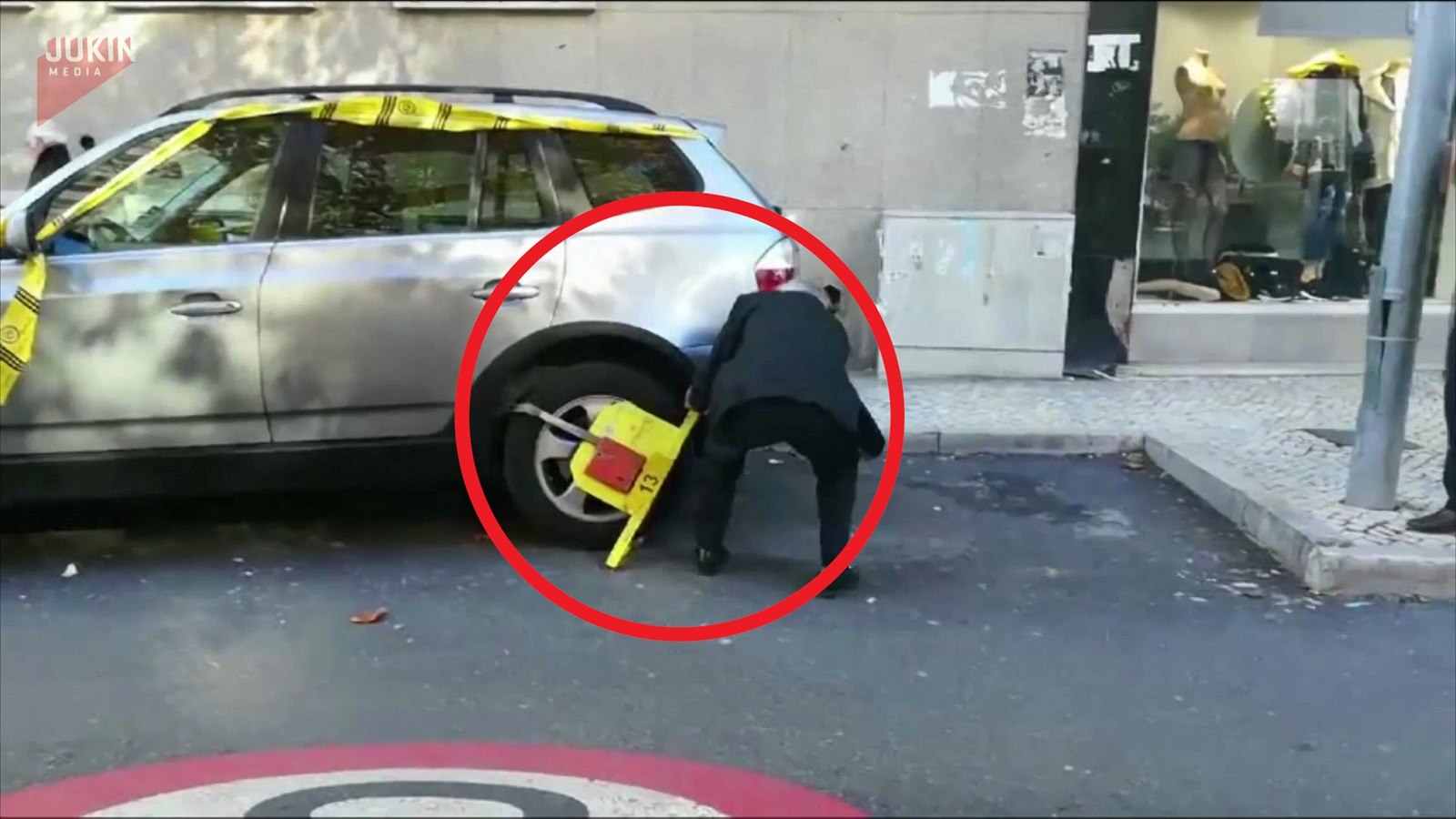 Ital, který dostal botičku za špatné parkování, si s problémem poradil velmi svérázně. Po několika pokusech se mu botičku skutečně podařilo sundat. Pak ji naložil do kufru, z auta sundal pásku a za smíchu pobavených lidí na ulici později odjel.