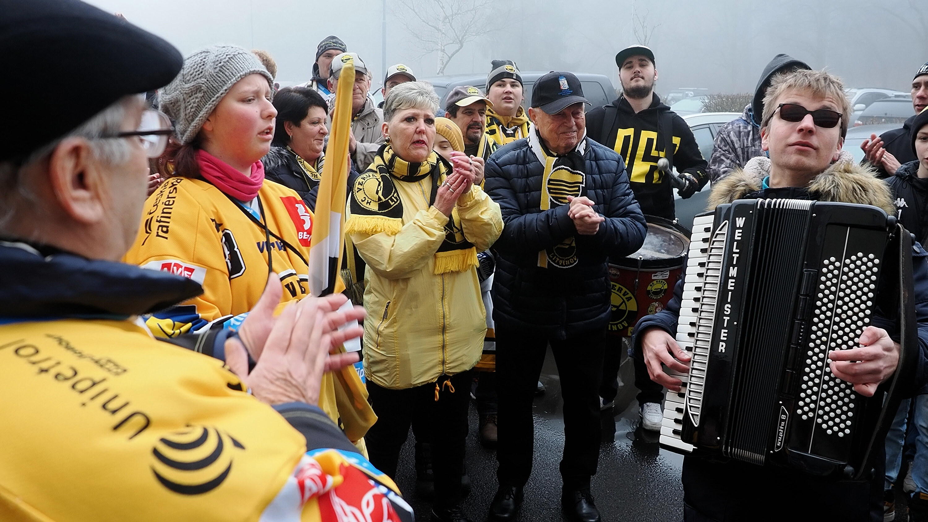 Nevidomý harmonikář si s fanoušky litvínovského hokeje zahrál lidovou píseň