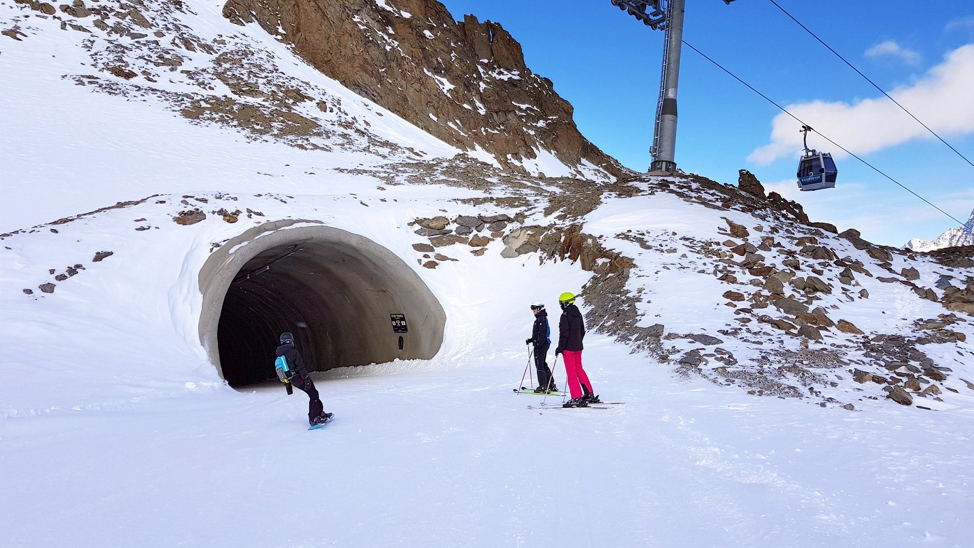 Nováčkové tady zastavují, ostřílení kaunertalští lyžaři i snowboardisté jedou dál do nitra masívu. Tunel o délce sto čtyřiceti metrů je vystlaný dostatečnou vrstvou sněhu, po němž se pohodlnými obloučky dostaneme za skalní hřeben i my. U spodního portálu musíme znovu zastavit, abychom vstřebali nové dojmy. Před námi se otevírá hlavní část Kaunertalského údolí, vidíme klikatou silnici a dolů pod nás padá černá sjezdovka.