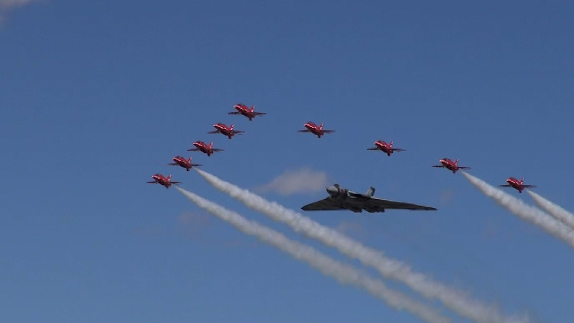 Unikátní průlet bombardéru Vulcan s Red Arrows