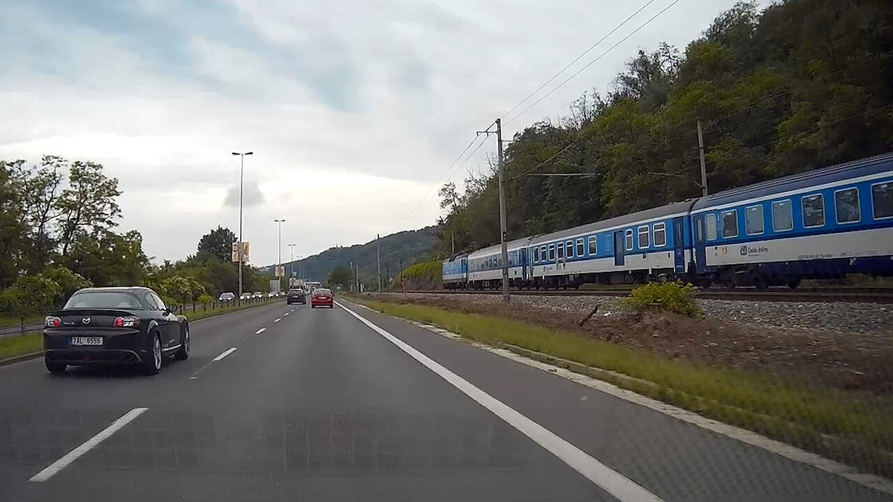 On-board kamera zachytila v provozu poměrně zajímavou situaci. Při jízdě po pražské Strakonické silnici, jela po souběžné trati na Plzeň vlaková souprava. Hádejte, kdo bude u Mostu Inteligence dřív, vlak nebo auto?
