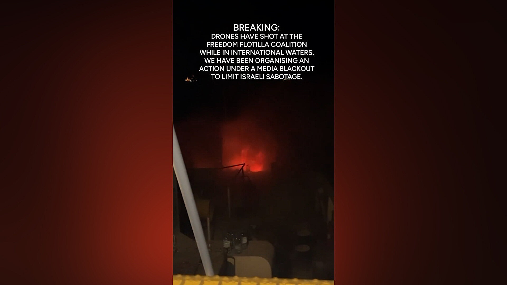 V pátek 2. května krátce po půlnoci byla v mezinárodních vodách poblíž Malty napadena drony humanitární loď Conscience, patřící koalici Freedom Flotilla. Útok způsobil požár a průnik vody do trupu plavidla. Na palubě bylo 16 osob, které vyslaly nouzový signál SOS. Maltské úřady na výzvu reagovaly a poskytly pomoc. Koalice Freedom Flotilla obvinila z útoku Izrael, který se k incidentu zatím nevyjádřil.