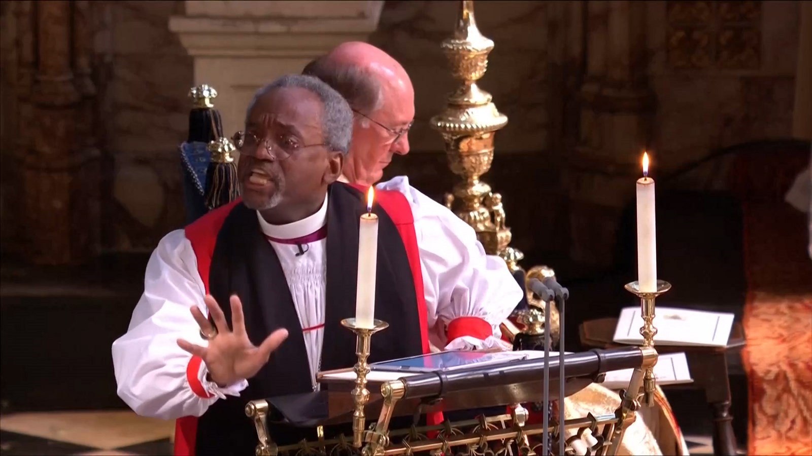 Černošský biskup Michael Bruce Curry zaujal během obřadu na královské svatbě prince Harryho a herečky Meghan Markle svým excentrickým projevem. Někteří přítomní hosté se neubránili pobaveným úsměvům a jiní jen nevěřícně valili oči.