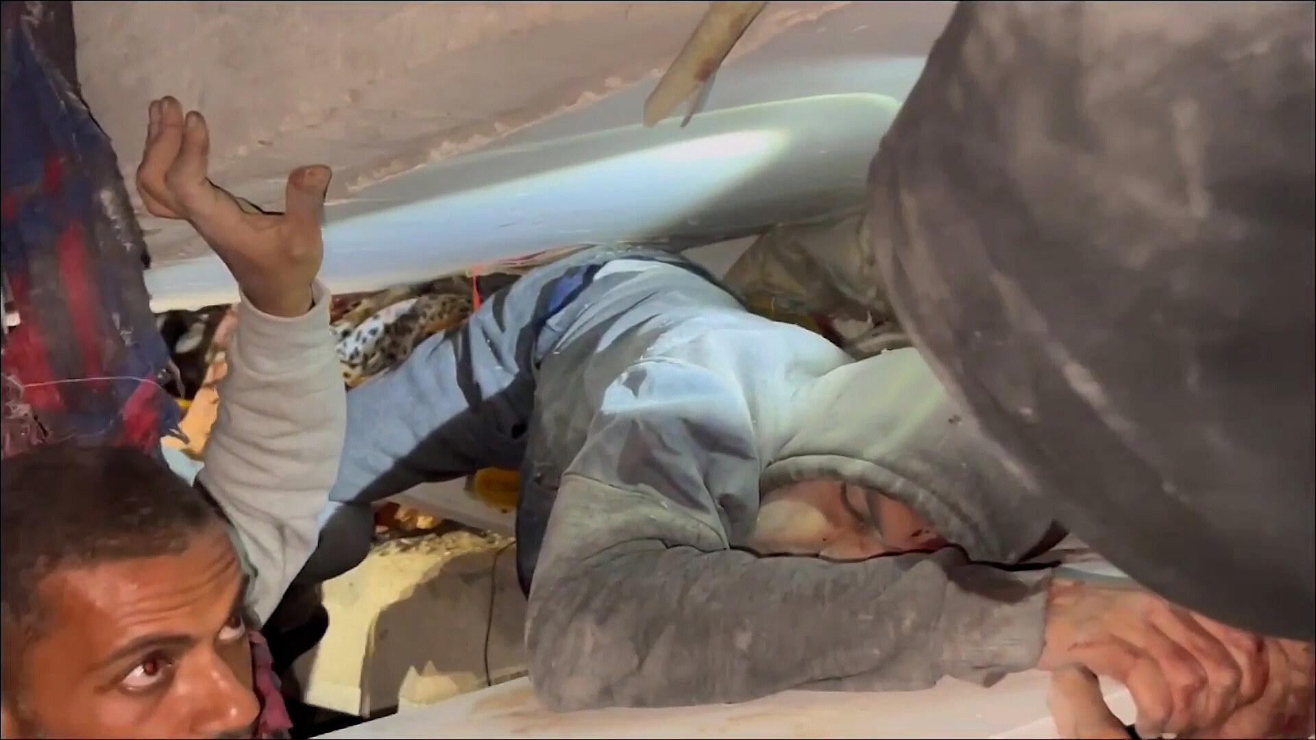 Záběry zveřejněné palestinskou civilní obranou v sobotu 9. března ukazují, jak záchranáři vytahují zraněné a mrtvá těla z trosek budovy ve městě Gaza. Budovu podle úřadů poškodil izraelský nálet.