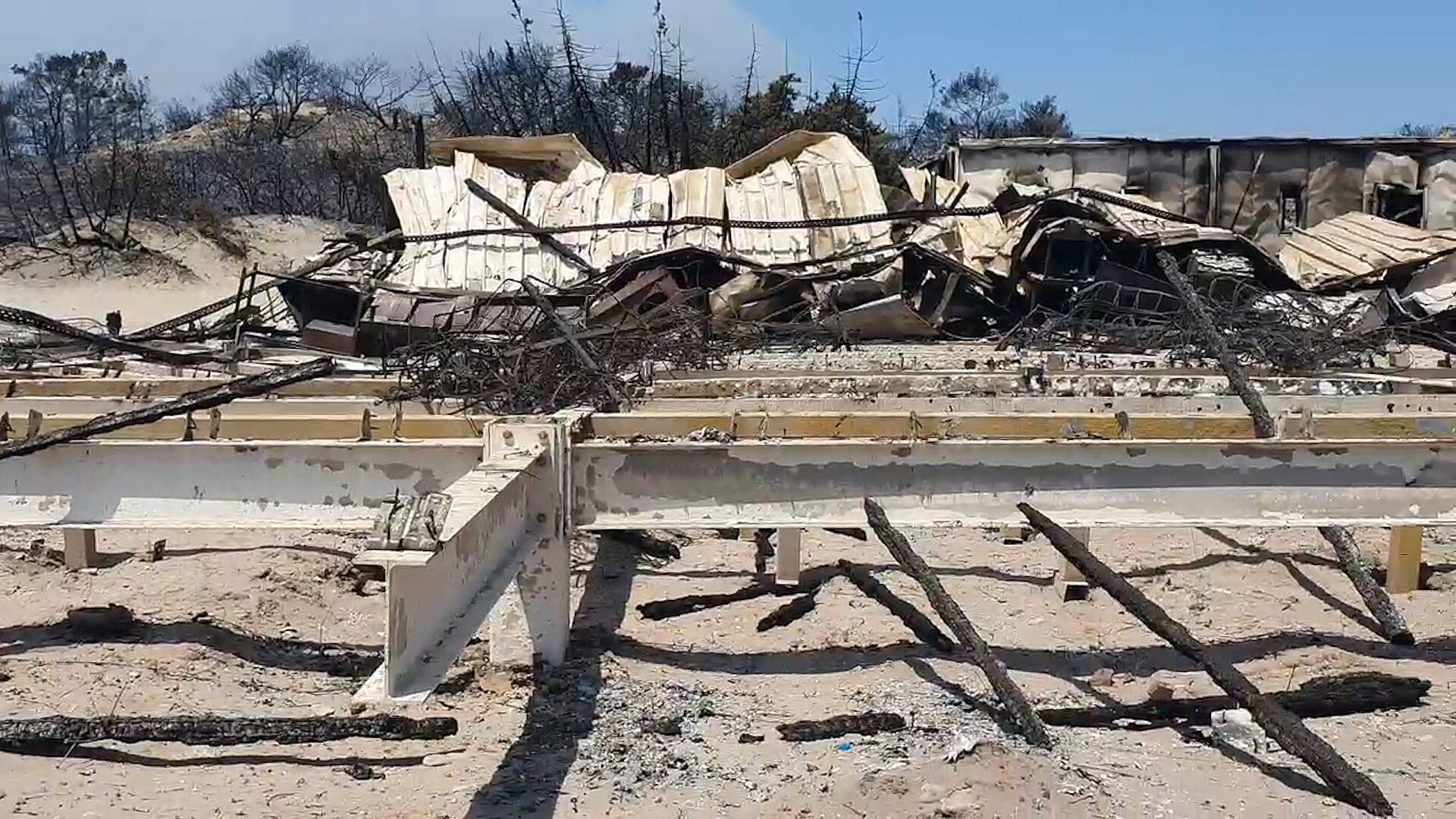 Řecko se mění ve spálenou zemi. Plameny zničily i oblíbenou restauraci a bar na Glystra Beach, zůstala pouze kovová konstrukce. Plameny během chvíle proměnily v popel i vše, co se nacházelo na pláži, od lehátek, přes slunečníky až po dřevěné chodníčky.