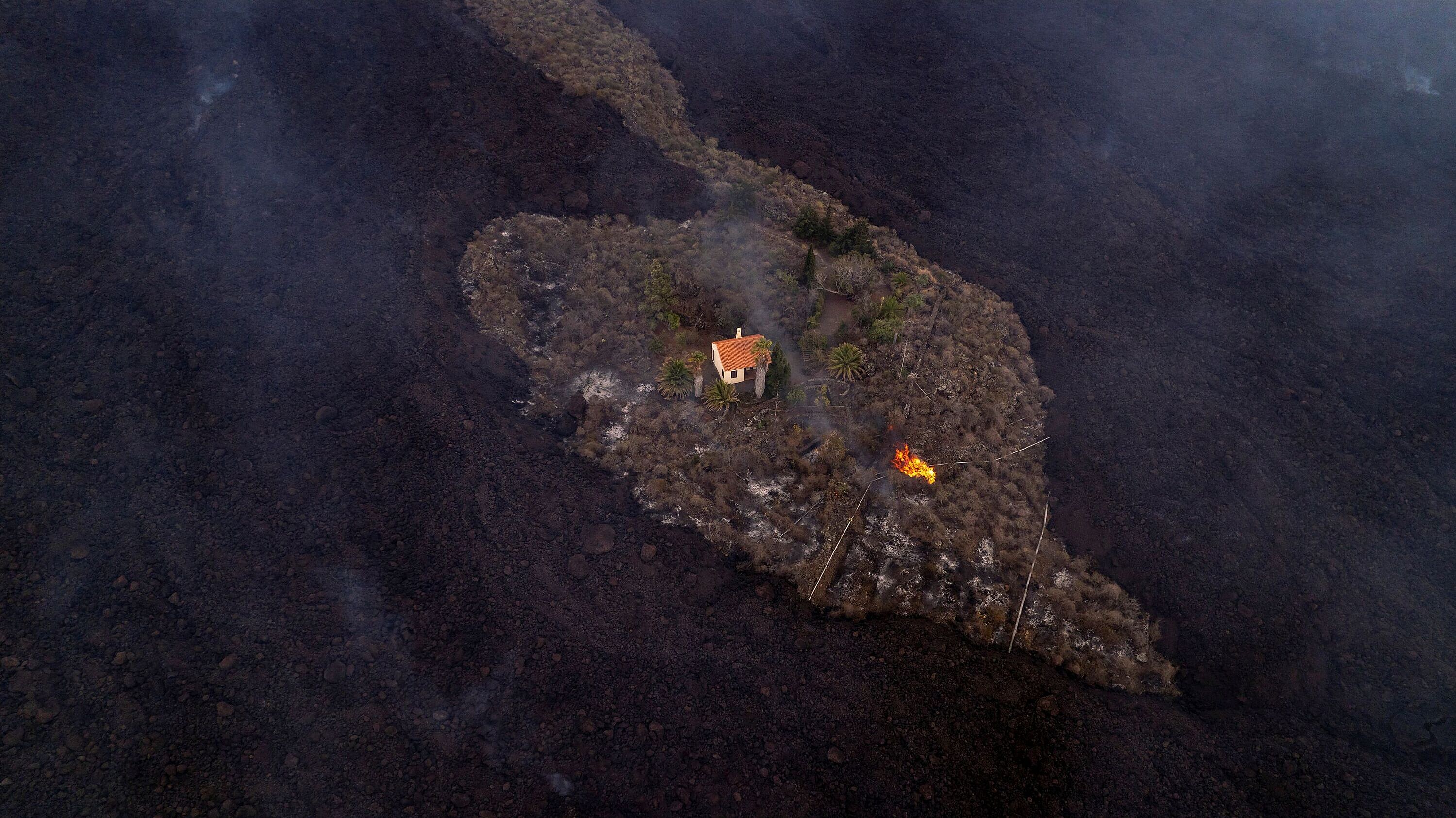 Při nedávné erupci sopky na Kanárských ostrovech zničila láva zhruba 350 domů. Jeden však zůstal nedotčen. Prázdninové sídlo dánských důchodců jako zázrakem vyvázlo naprosto nepoškozené, zatímco kolem něj je jen zkáza. Snímek se „zázračným domem“ obletěl internet. Láva možná nakonec nepronikne až k moři, její postup se výrazně zpomalil, uvedli experti.