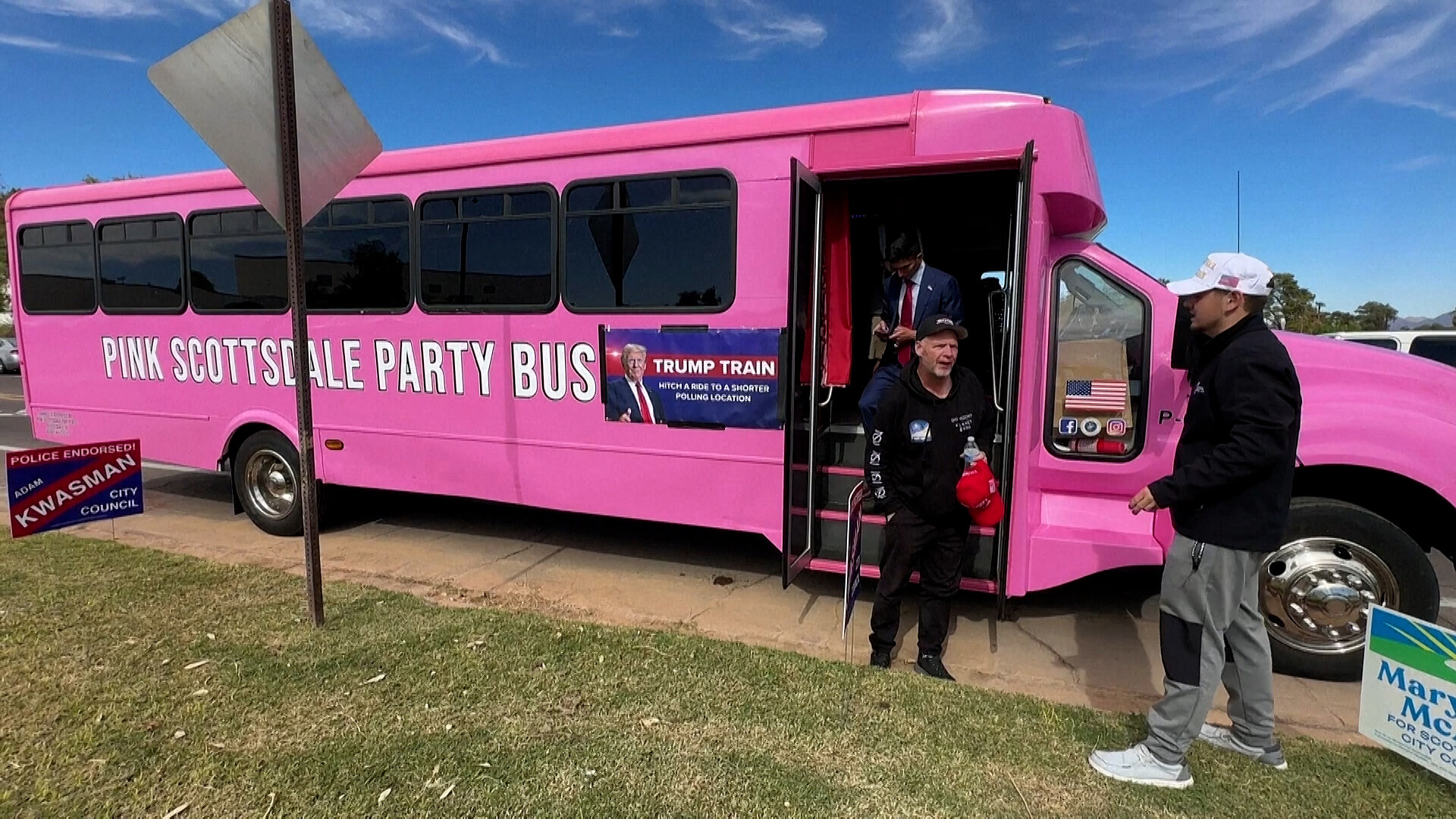 Mezi rušnými a klidnými volebními místnostmi v americké Arizoně pendloval růžový autobus Trump Train. Voliči se díky tomu mohli vyhnout dlouhým frontám. Autobus, na jehož palubě se rozdávaly Trumpovy typické červené čepice, ale přitom řídil volič Kamaly Harrisové.