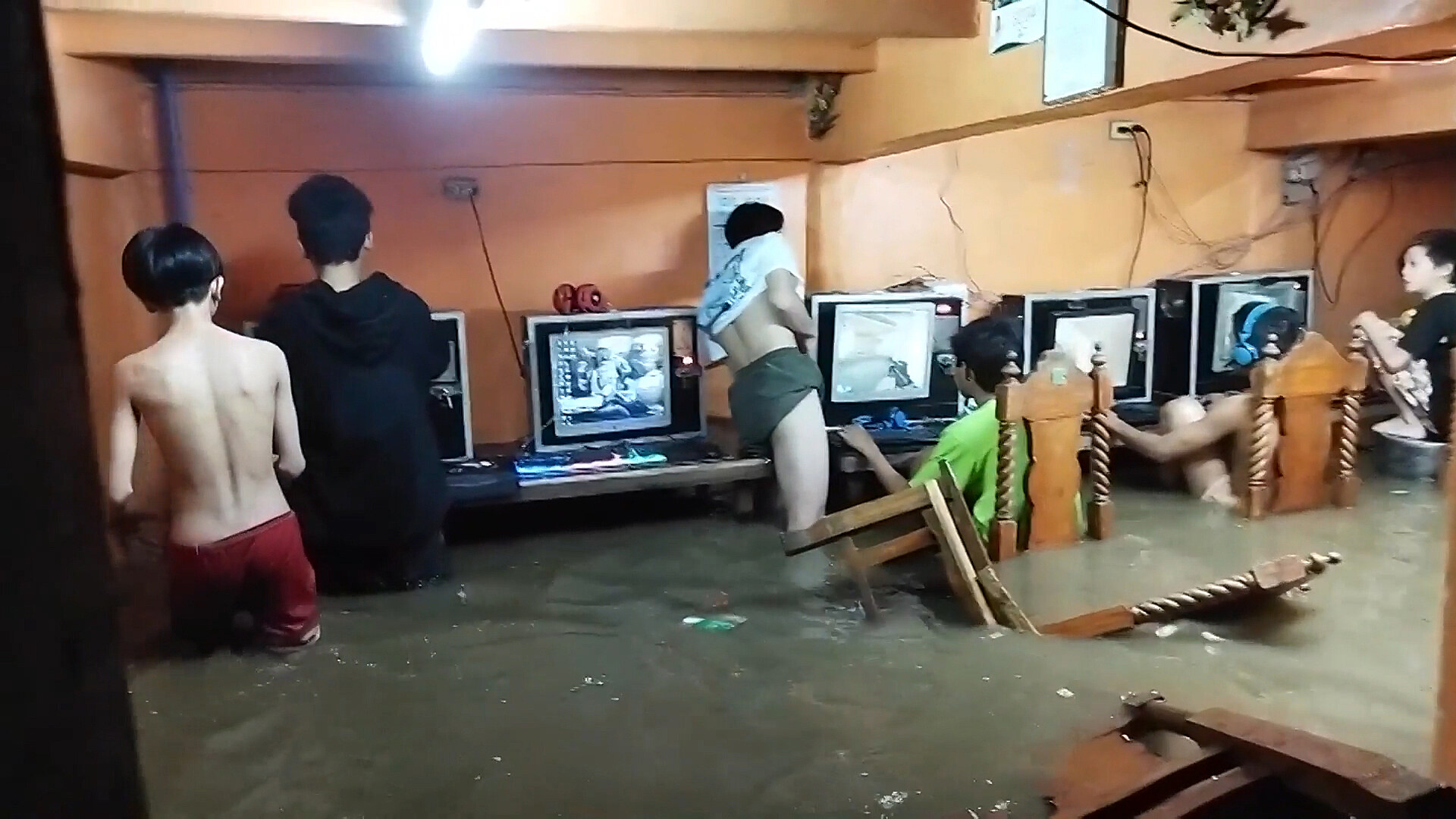 Závislé hráče počítačových her v kavárně ve filipínském městě Cainta nezastavil ani tajfun, který udeřil 22. července. Silný přívalový déšť zaplavil kavárnu, ale ani tento fakt nedonutil přítomné zastavit online hru na počítačích. Znepokojený majitel Sio Samson zaznamenal bizarní scénu, když se snažil vyprovodit chlapce ze svého podniku s obavami, že by je mohl zabít elektrický proud.