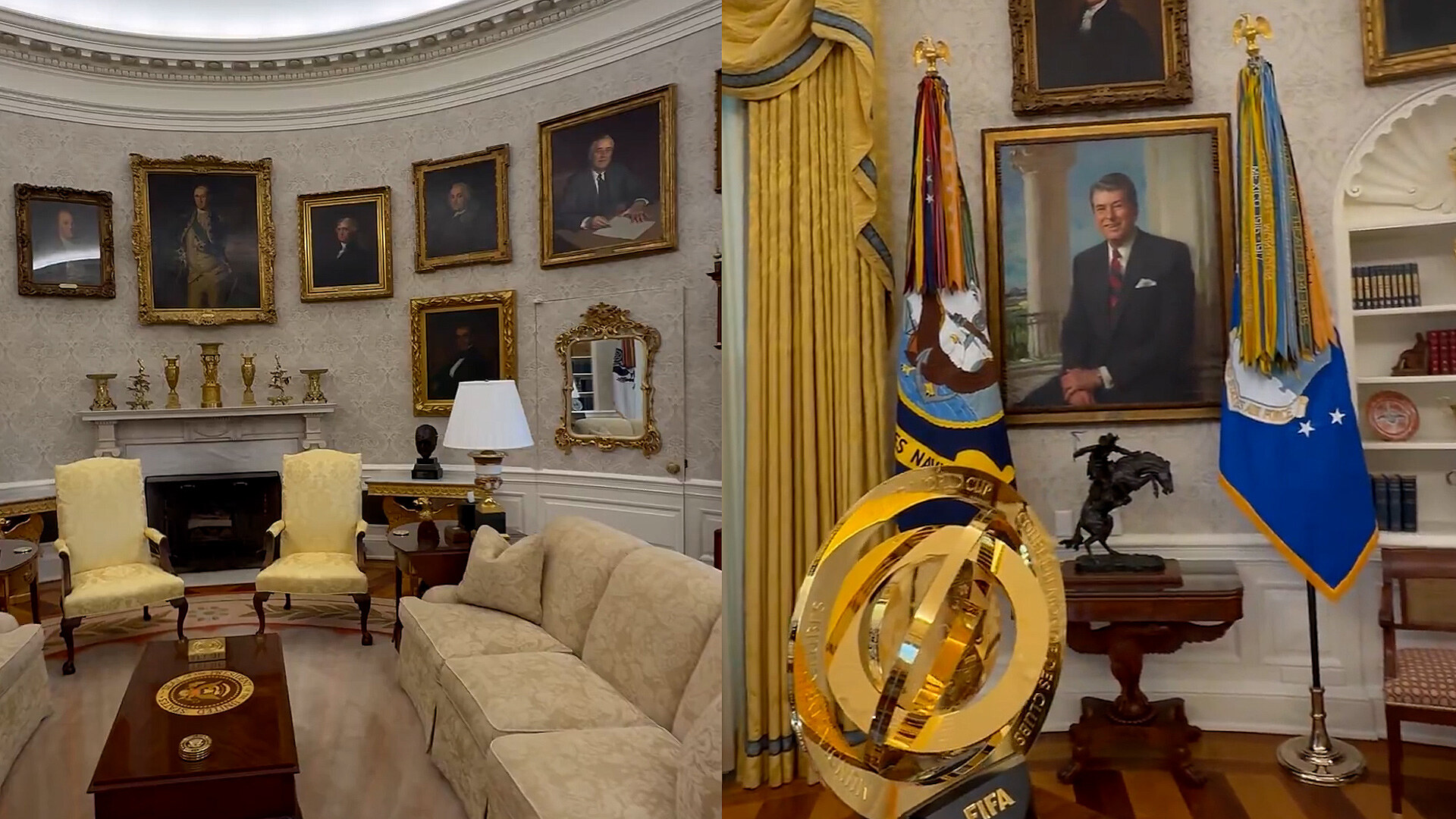 Donald Trump krátce po návratu do Bílého domu začal s přestavováním Oválné pracovny. Zprvu poměrně decentní úpravy se s přibývajícími týdny v úřadu poněkud zvrtly. Zahraniční státníky vítají desítky portrétů amerických prezidentů a všudypřítomné zlato, nechybí ani rodinné fotografie.